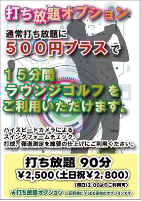 『打ち放題』にプラス500円で15分間『ラウンジゴルフ』をご利用いだだけます。ハイスピードカメラによるスイングフォームチェック、打球、弾道測定を練習の仕上げにご利用ください。※打席での打ち放題終了後の適用となります。