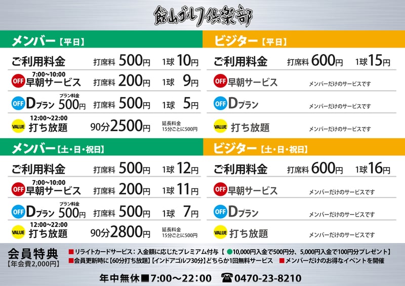 いつも館山ゴルフ倶楽部をご利用頂いている皆様に、たいへんお得な特典がつくゴールドメイト会員様を年会費2,000円でご案内しています。ご入会は受付カウンターにてお申し付けください。