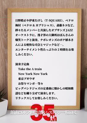 館山ゴルフ倶楽部・レストラン一粒の麦の35周年記念イベント』として、一粒の麦にて『オブサンズJAZZオーケストラディナーショー』を開催!【一粒の麦特製洋風懐石膳】と素敵なエンターテイメントをお愉しみください!限定50名様にて前売り券発売中です!●日程:10月26日(土) ディナータイム 17:00~18:00 ショータイム 18:00~20:30●料金:10,000円(税込)【 食事付、フリードリンク(飲み放題) 】