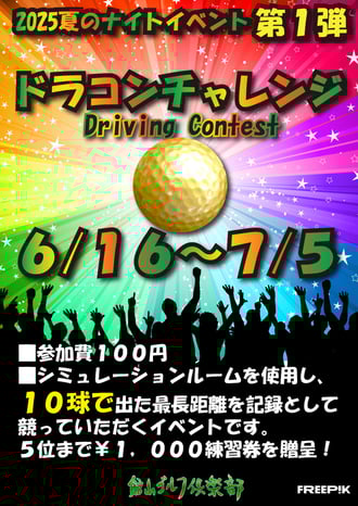イベント情報 · 2025/06/16 夏のナイトイベント第1弾!『ドラコンチャレンジ‼』 10球を打って出た最長距離を競うイベントです。5位までの方には練習券を1,000円分贈呈いたします。■開催期間:6/16(月)~7/5(土) ■参加費:100円 ■開催場所:シュミレーションルーム ※体力差を考慮し一般とレディース部門にわけてランキングします tagPlaceholderカテゴリ:
