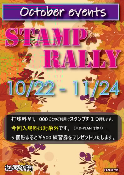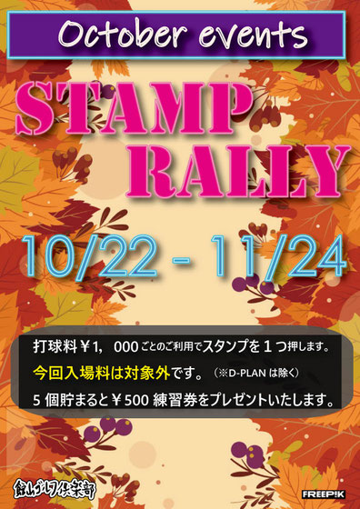 イベント情報 · 2025/10/21 『スタンプラリー』を開催! 打球料¥1,000以上のご利用でスタンプが1個たまる!5個たまると¥500の練習券をプレゼント‼開催期間:10/22(水)~11/24(月) 今回のスタンプラリーは打席料(入場料)は対象外(Dプランは除く)とさせていただきます。※1球打ちの「打席料(入場料)」は含まず、打った球数の代金のみで¥1,000以上のご利用とします。「Dプラン」および「打ち放題」は利用金額の総額がスタンプの対象となります。また、川本大地プロのレッスン代はスタンプラリーの対象外とさせていただきます。 tagPlaceholderカテゴリ: